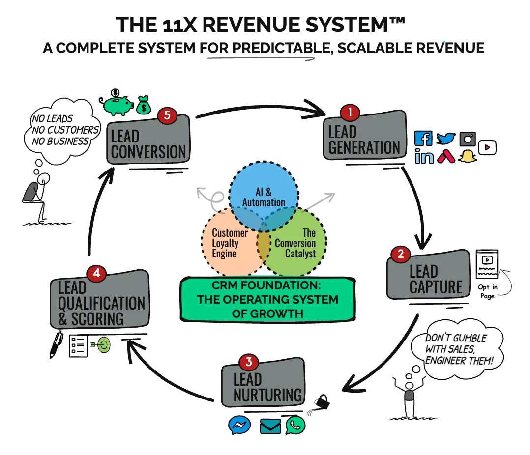 The 11X Revenue System is a five-stage framework designed to create consistent, scalable revenue.